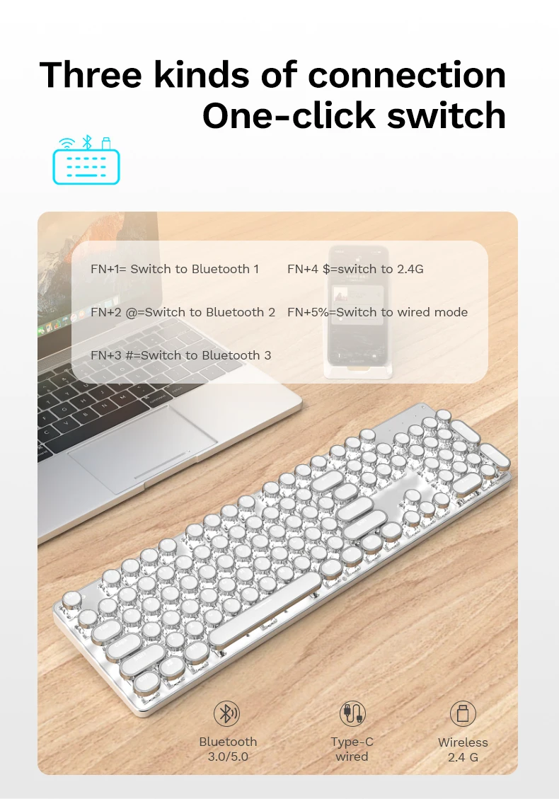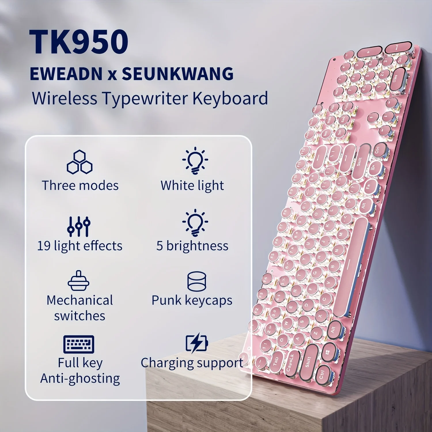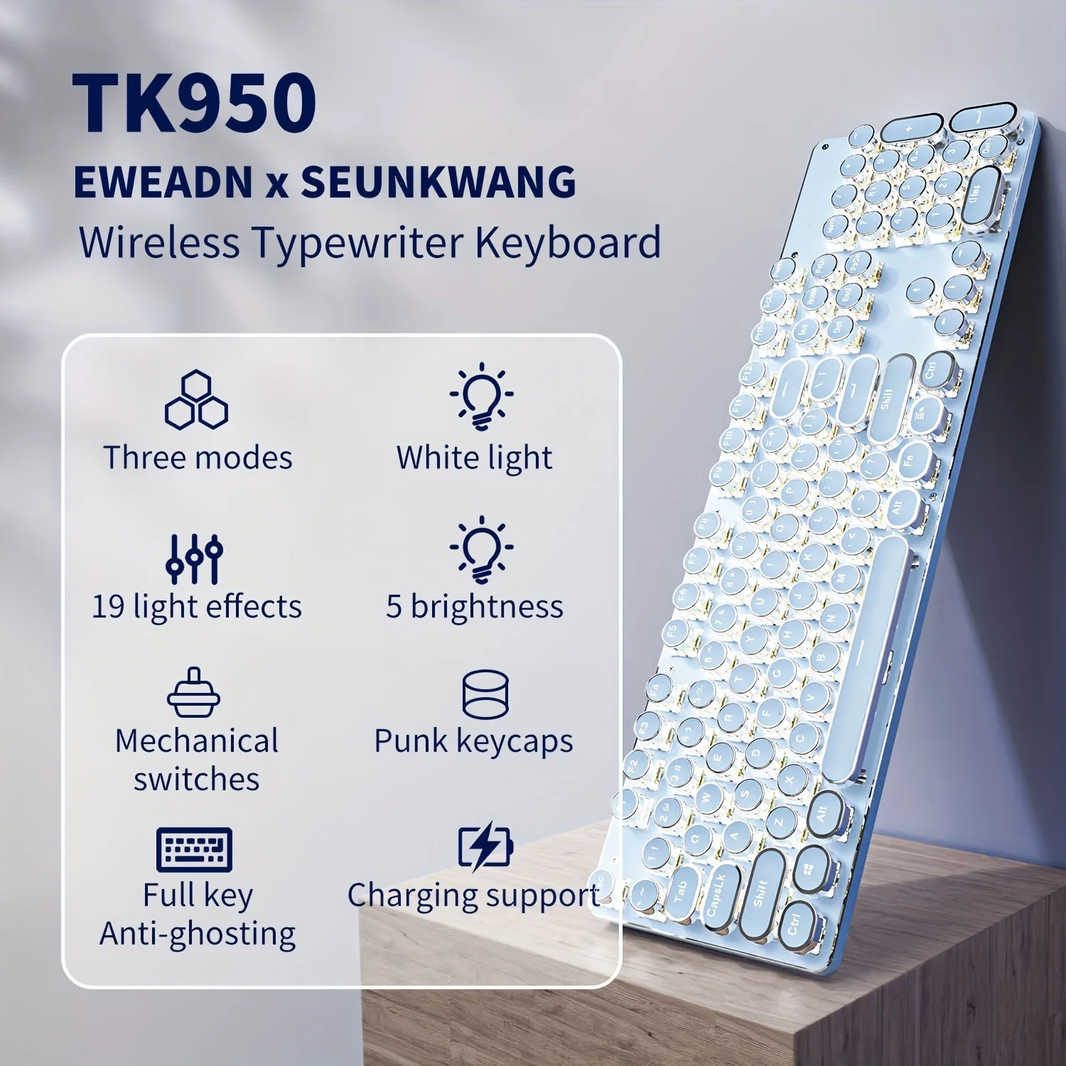 EWEADN TK950 Wireless Punk Typewriter Mechanical Keyboard, Game Office Triple Mode Wireless 5.0/2.4G/Wired, Ergonomic Keyboard