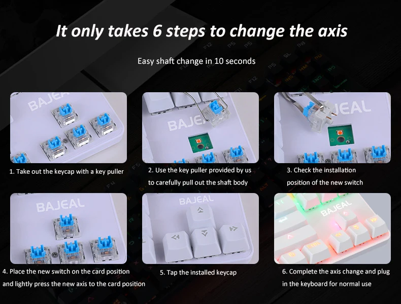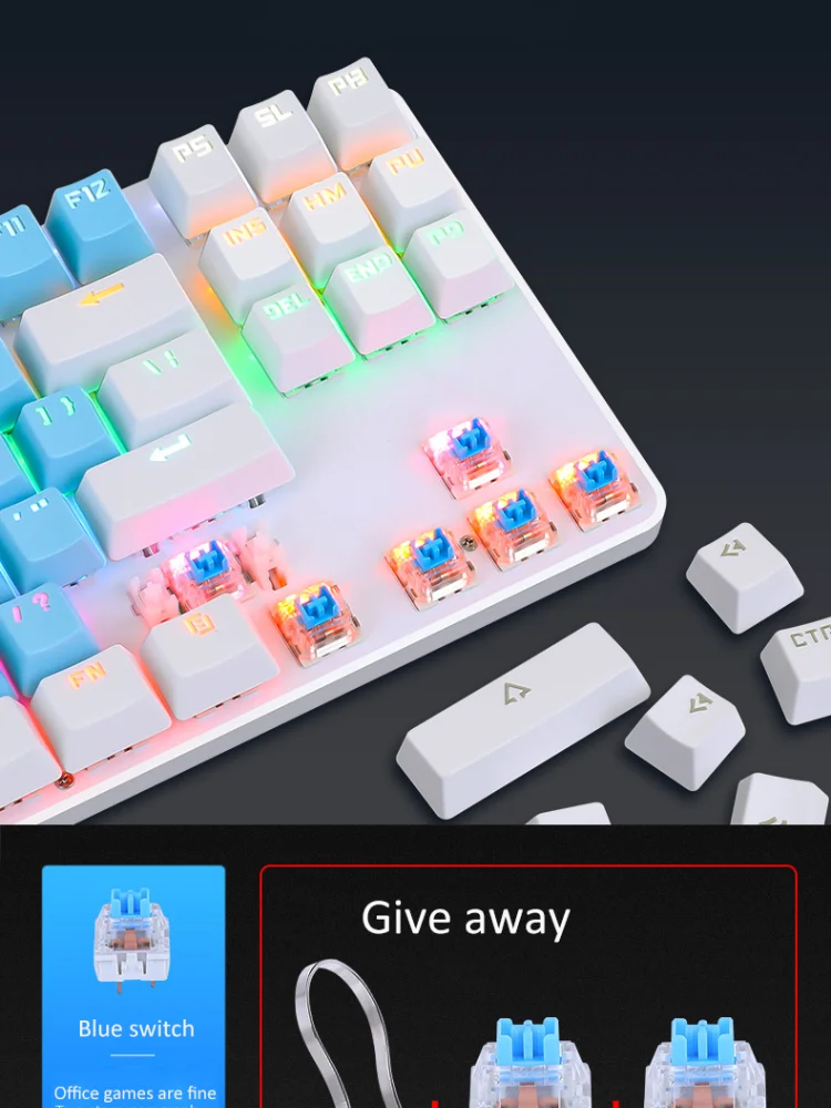 SPECIFICATIONS Application: Desktop Battery Included: No Brand Name: KLW Certification: CE,RoHS Color: White&blue,Blue&White,Pink&White,White&Pink Full Size keyboard: Yes Hign-concerned Chemical: None Interface Type: USB Keyboard Standard: 87 Keys Language: English Model Number: K100 Operation Style: Mechanical Origin: Mainland China Package: Yes Style: Standard,Slim,Ergonomics,Multimedia,Gaming,For Laptop Type: Wired Wrist Support: No Views: 0