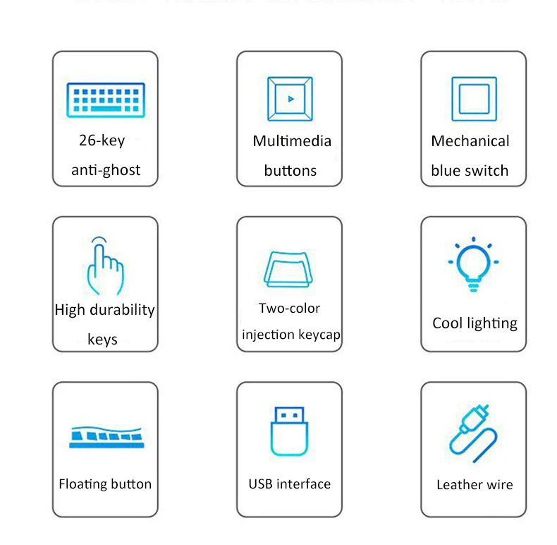 SPECIFICATIONS Application: Desktop Battery Included: No Brand Name: KLW Certification: CE,RoHS Color: White&blue,Blue&White,Pink&White,White&Pink Full Size keyboard: Yes Hign-concerned Chemical: None Interface Type: USB Keyboard Standard: 87 Keys Language: English Model Number: K100 Operation Style: Mechanical Origin: Mainland China Package: Yes Style: Standard,Slim,Ergonomics,Multimedia,Gaming,For Laptop Type: Wired Wrist Support: No Views: 0