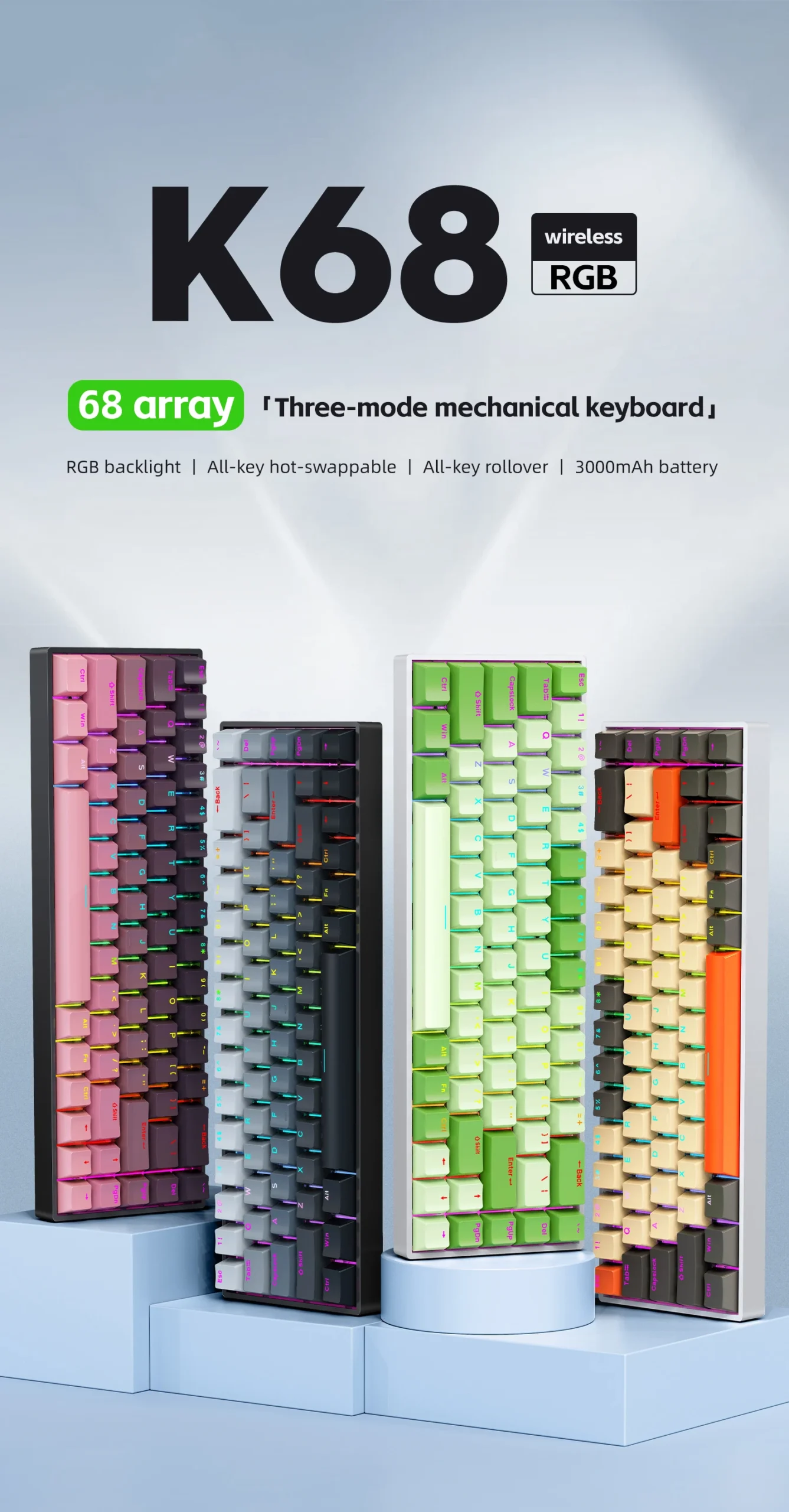 Product Specifications:Number of buttons:68 keysProduct Model:K68 three-mode wireless keyboardShaft type:Mechanical blue switchesConnection:Tri-mode (wired/2.4G/Bluetooth)Keycap Material:ABS two-color injection molding processShaft life:50 million timesShaft design:All-key hot-swappableBattery capacity:3000 mAhKeyboard rollover:The full key is conflict-freeKeyboard lighting effects:20 lighting modesKeyboard Size:Approximately L310*W100*H38mmKeyboard Weight:Approximately 470g![]() 1 X Mechanical Keyboard